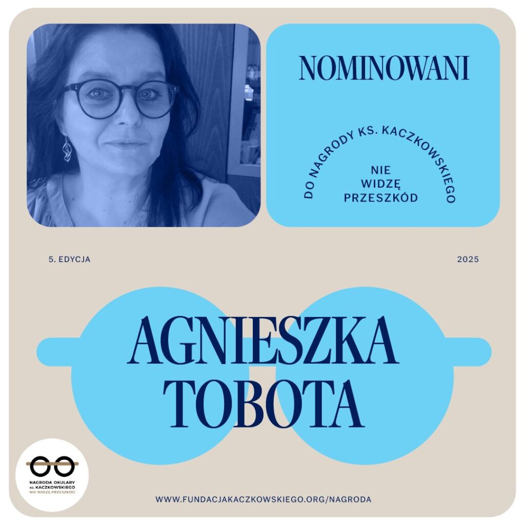 To cechy, które łączą tegorocznych nominowanych do Nagrody „Okulary ks. Jana Kaczkowskiego – Nie widzę przeszkód”. Wśród dziesięciu wyjątkowych osób i organizacji znalazła się również Agnieszka Tobota – prezeska Fundacji A.R.T., pedagożka, autorka i inicjatorka działań na rzecz kobiet i osób w kryzysie przemocy.