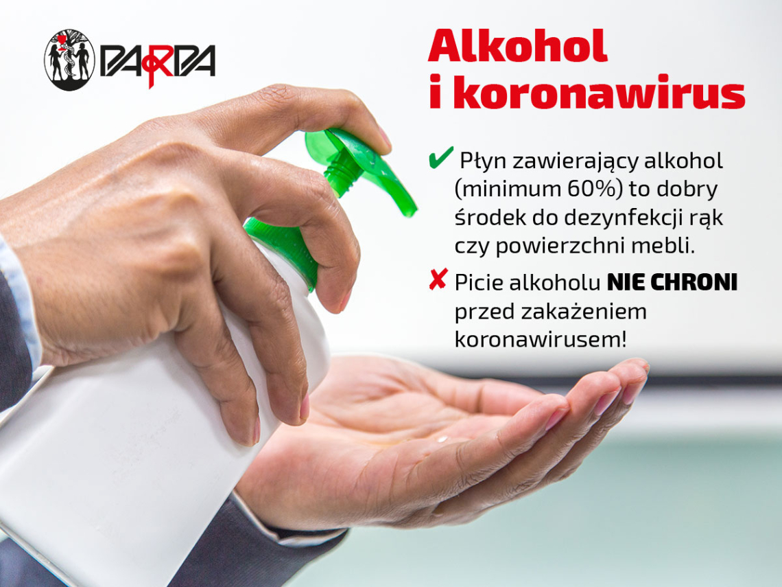 Wysokoprocentowy alkohol stał się dla wielu osób towarem pierwszej potrzeby do walki z epidemią. Internauci prześcigają się w pomysłach na samodzielne sporządzenie płynów do dezynfekcji rąk, eksperci zalecają regularne odkażanie stołów, klamek i telefonów. Niektórzy jednak rozumieją te komunikaty w niewłaściwy sposób i wierzą w to, że alkohol ma moc dezynfekowania… organów wewnętrznych. Światowa Organizacja Zdrowia przestrzega: picie alkoholu w żaden sposób nie chroni przed zakażeniem! Wręcz przeciwnie.