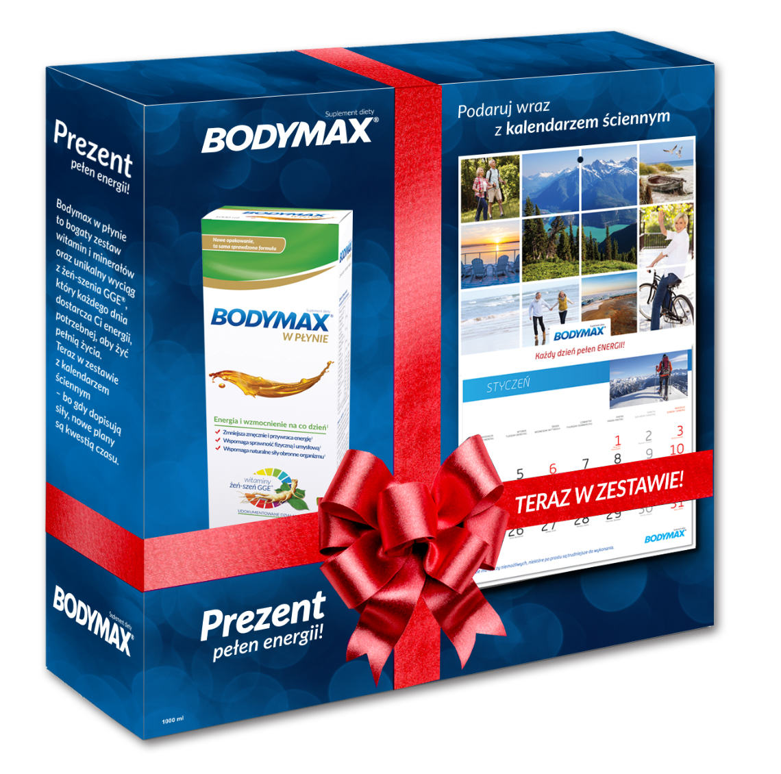 W promocji z kalendarzem książkowym dostępne są opakowania Bodymax Plus (200 tabletek) oraz Bodymax 50+ (2 razy 60 tabletek) natomiast Bodymax w płynie (1000 ml) dostępny jest z praktycznym kalendarzem ściennym.
