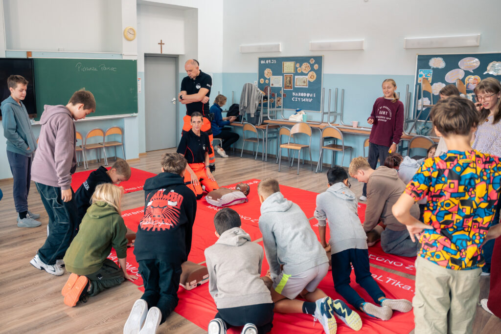 - pierwszą pomoc (reagowanie, rola świadka, plan bezpieczeństwa),